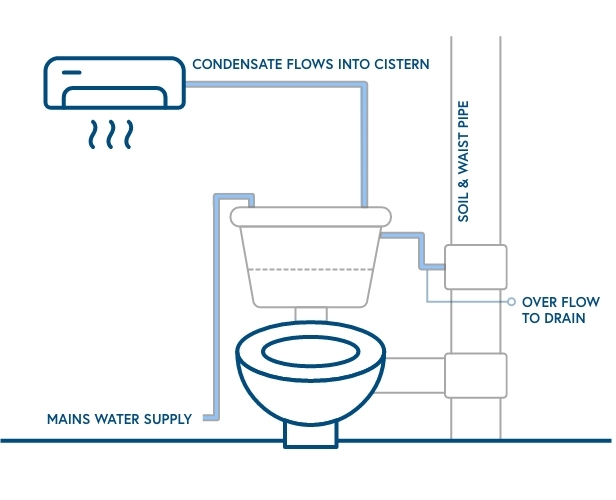 Air conditioning units generate large volumes of water, which typically flow straight into the waste pipe. Getford offers an innovative solution that redirects this water through the toilet cistern, allowing it to be reused for flushing toilets.