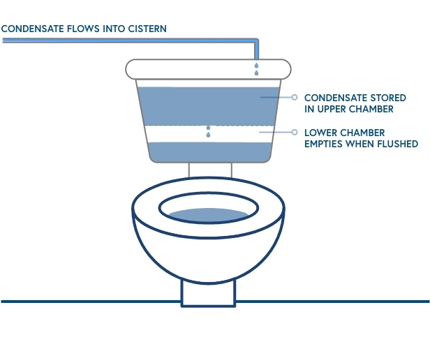 The cistern will install operates just like a traditional cistern, but with one key difference — it includes an additional inlet that allows it to draw water from a secondary source, such as air conditioning condensate. Holding 18 litres — three times more than a standard cistern — its patented dual-chamber design ensures it still fits within the same space as conventional models.
